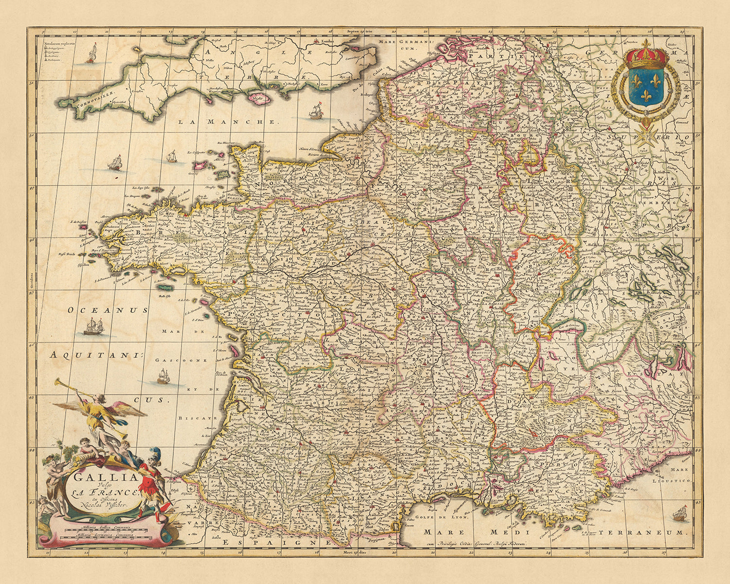 Mapa antiguo de Francia: 'Gallia Vulgo' de Visscher, 1690