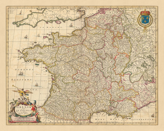 Este mapa 'Gallia Vulgo La France' de Nicolaes Visscher II ofrece un viaje fascinante a través de los paisajes, las ciudades y las divisiones políticas de la Francia del siglo XVII. Si es un aficionado a la historia, un entusiasta de la cartografía o simplemente alguien que aprecia el arte fino, este mapa seguramente será una adición cautivadora a su colección.