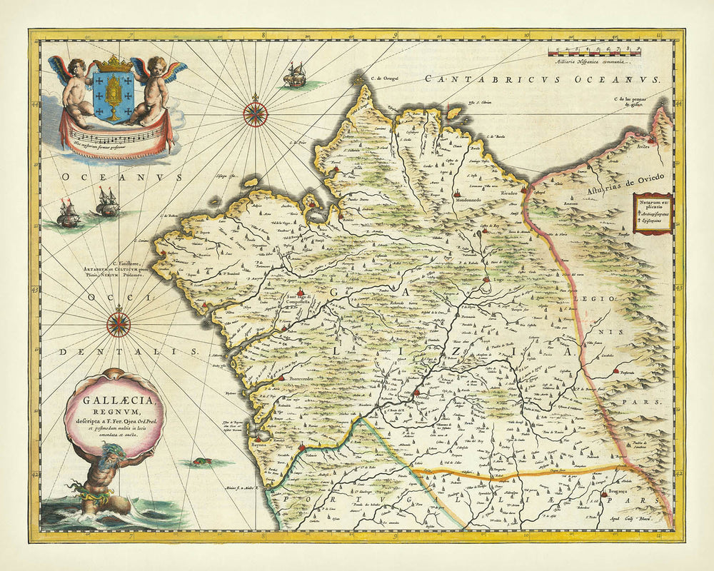 El mapa de Blaeu es un testimonio de su inigualable destreza, presentando un cartucho decorativo de escala de millas adornado con un escudo de armas sostenido por querubines. Este toque artístico simboliza el poder gobernante de la región, mientras que la presencia de Neptuno, el dios romano del mar, subraya la herencia marítima de Galicia. Los intrincados elementos de diseño del mapa, que incluyen barcos de vela y un monstruo marino, evocan la aventura y el misterio de los viajes marítimos del siglo XVII, ofreciendo un vistazo al espíritu de exploración de la época.