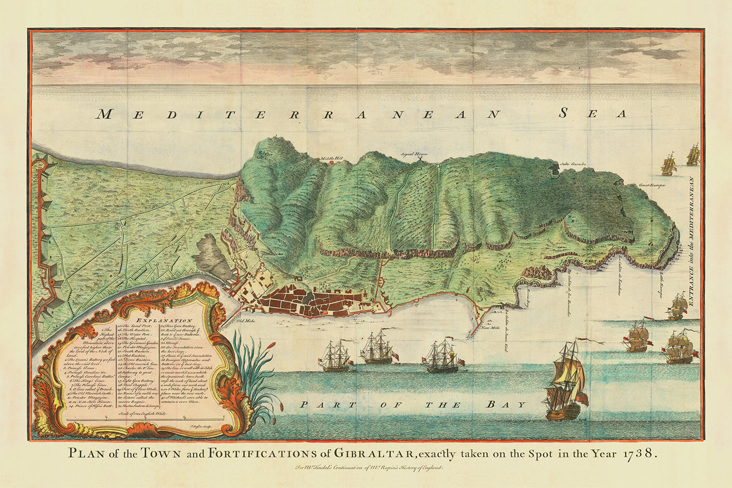 Mapa antiguo de Gibraltar por Paul de Rapin, 1745: Ciudad de Gibraltar, Bahía de Gibraltar, Estrecho de Gibraltar, Mar Mediterráneo