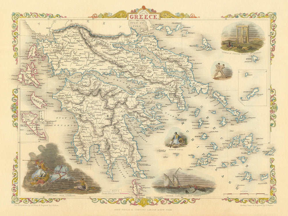 John Tallis, una luminaria en el mundo de la cartografía decorativa, aporta su estilo característico a este mapa, entrelazando la elegancia artística con un detalle geográfico preciso. Conocido por su trabajo con el Atlas Ilustrado de R. Montgomery Martin, los mapas de Tallis son celebrados por su atractivo estético y profundidad histórica. Su representación de Grecia y las Islas Jónicas no es una excepción, presentando viñetas evocadoras que ofrecen vislumbres de la esencia cultural e histórica de la región. Desde antiguos carros de guerra hasta escenas de corsarios griegos navegando cerca de Corfú, cada ilustración enriquece la comprensión del espectador sobre el vibrante pasado de la zona.