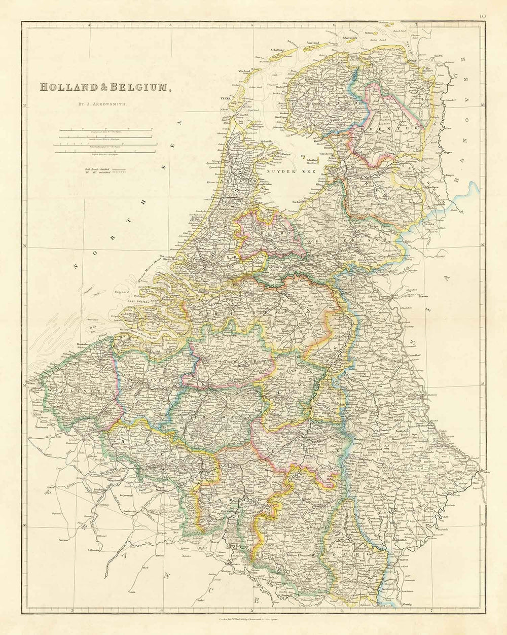 Un hermoso mapa de Bélgica y Holanda, publicado originalmente en 1858 por probablemente el cartógrafo más buscado de mediados del siglo XIX, John Arrowsmith.
