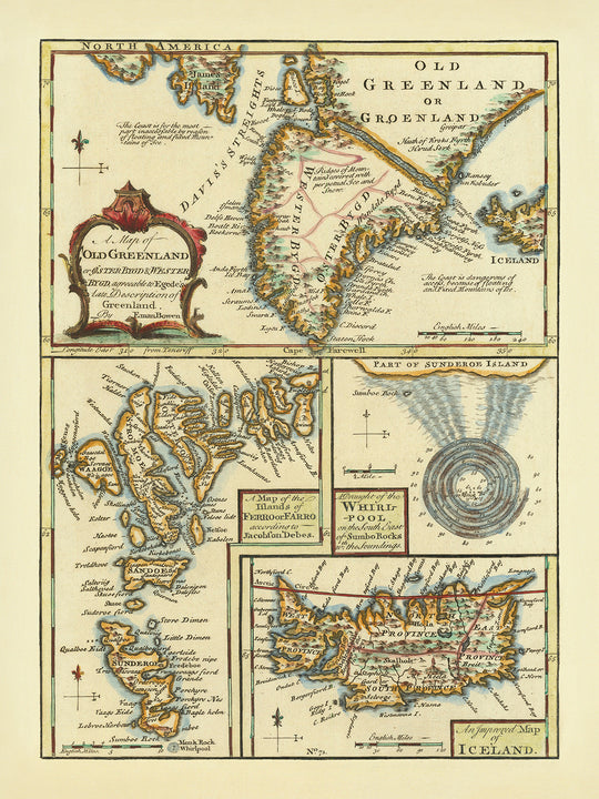 Mapa antiguo de Islandia, Islas Feroe y Groenlandia por Bowen, 1747: Skalholt, Holum, Suðuroy, Estrecho de Davis, Whirlpool