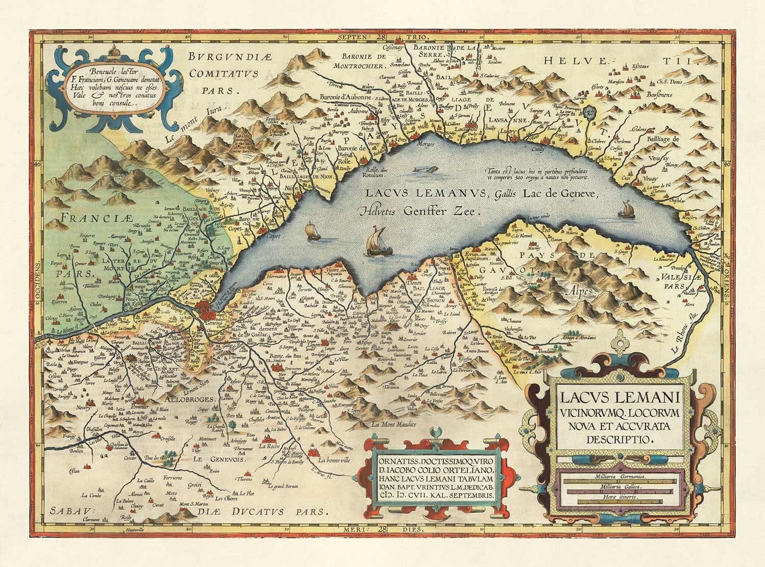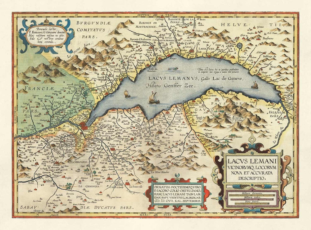 Un mapa de Abraham Ortelius de Lago de Ginebra, Suiza, encantadoramente característico y extremadamente raro, publicado originalmente en 1573 como parte del Theatrum Orbis Terrarum, el primer atlas moderno del mundo.