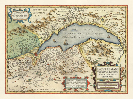 Antiguo mapa del lago Lemán de Abraham Ortelius, 1573: Lausana, Montreux, Thonon-les-Bains, Evian, Nyon, Morges