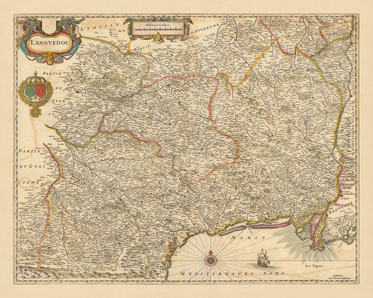Descubra la rica historia y la intrincada belleza de 'Languedoc', un impresionante mapa elaborado por las hábiles manos de Nicolaes Visscher II en 1690. Como figura destacada de la Edad de Oro holandesa de la cartografía, el trabajo de Visscher es un testimonio de la precisión y el arte de esta era. Este mapa, centrado en la provincia de Languedoc en Francia, ofrece una visión de las divisiones políticas y geográficas de la época. El nombre "Languedoc" se traduce como "Lengua de Oc", en referencia al idioma occitano que se habla en esta región del sur de Francia.