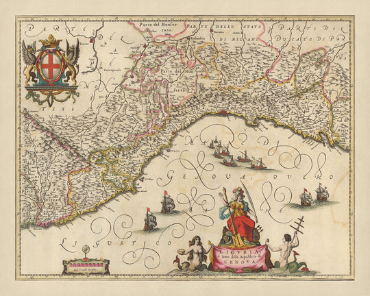Descubra el encanto del pasado con nuestro exquisito mapa, 'Liguria, o stato della republica di Genova', traducido como 'Liguria, o el estado de la República de Génova'. Esta intrincada pieza fue creada por Nicolaes Visscher II en 1690, una figura prominente de la Edad de Oro holandesa de la cartografía. El mapa presenta una descripción detallada de las regiones y divisiones políticas de Liguria y la República de Génova, áreas que ahora forman parte de la Italia actual. Esto no es simplemente un mapa, sino una pieza de historia que cuenta una historia de fronteras políticas, paisajes urbanos y paisajes naturales de hace más de tres siglos.