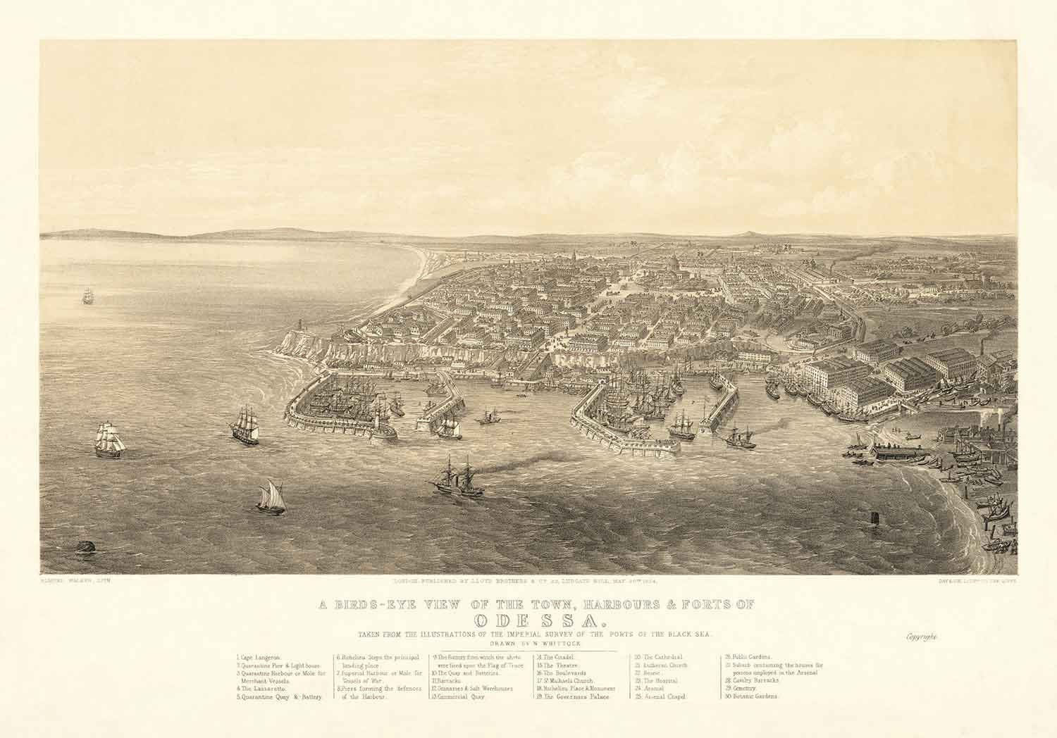 Una vista de pájaro encantadora y excepcionalmente rara de Odessa, publicada originalmente en 1855 por N. Whittock de Londres.