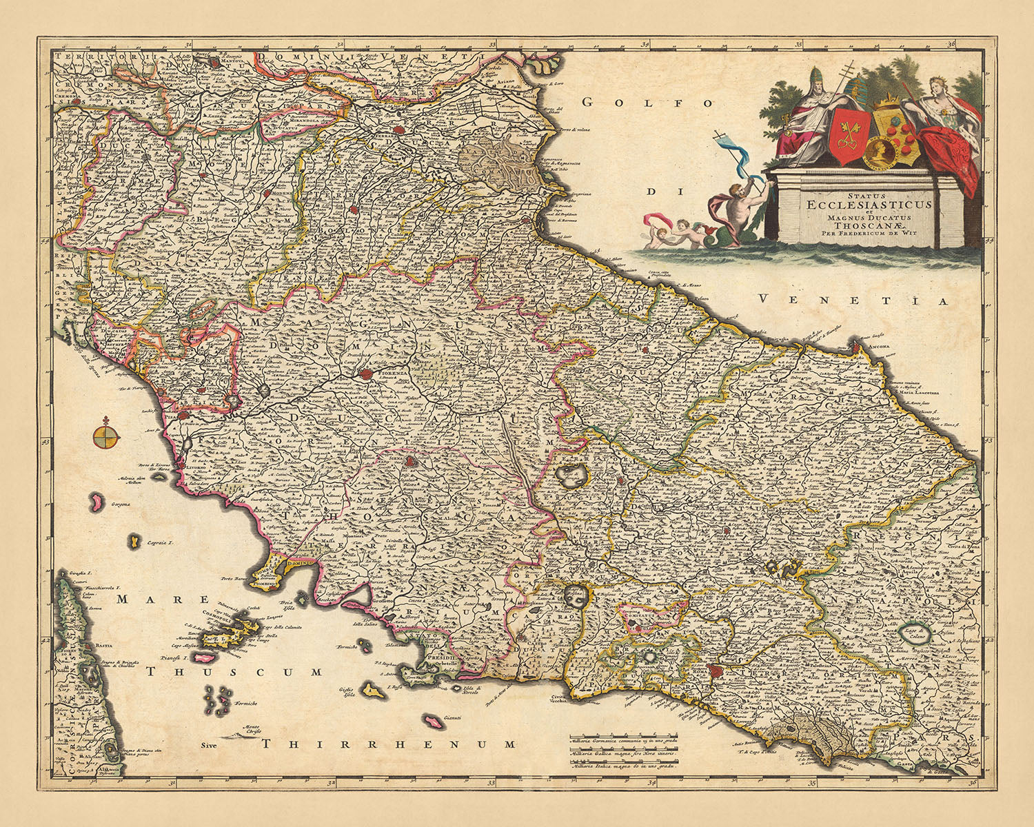 Sumérgete en la grandeza del pasado con nuestro mapa meticulosamente detallado, 'Status Ecclesiasticus et Magnus Ducatus Thoscanae'. Traducido del latín, el título se refiere al "Estado Eclesiástico y Gran Ducado de Toscana", que es el foco principal de esta obra maestra cartográfica. Elaborado por Nicolaes Visscher II en 1690, este mapa muestra las divisiones políticas y geográficas de los Estados Pontificios y el Gran Ducado de Toscana, regiones que ahora forman parte de la Italia actual. Visscher, una figura notable de la Edad de Oro holandesa, era nieto de Claes Janszoon Visscher, famoso por sus exquisitas habilidades cartográficas.