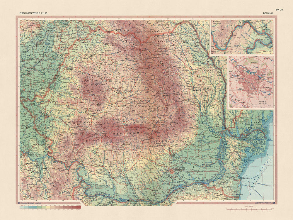 Este mapa de Rumania de 1967, publicado por el Servicio de Topografía del Ejército Polaco, es un mapa político y físico detallado que proporciona una descripción completa de la geografía y el panorama político del país. El foco principal del mapa está en Rumania, con sus fronteras claramente delineadas y sus principales ciudades, pueblos y características físicas marcadas de manera destacada. El mapa también incluye recuadros de la Puerta de Hierro y Bucarest, lo que proporciona detalles adicionales sobre estas importantes áreas.