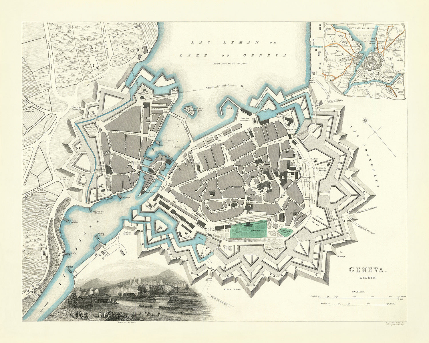 Antigua Mapa de Ginebra por SDUK, 1870: Lago de Ginebra, Río Ródano, Jardín Botánico, Masivas Fortificaciones del Fuerte Bastión