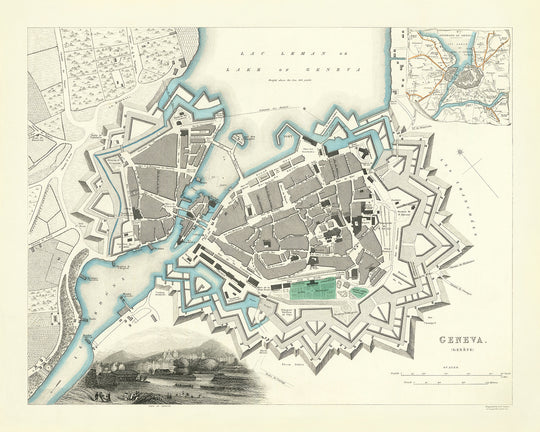 Más allá del casco antiguo, el mapa se extiende a los barrios circundantes, incluidos Les Pâquis, Eaux-Vives y Champel. Estas áreas presentan una combinación de edificios residenciales, comerciales e institucionales, lo que refleja el tejido urbano diverso de Ginebra. El mapa también muestra las extensas fortificaciones de la ciudad, en particular las fortificaciones del Fuerte Bastión, que desempeñaron un papel crucial en la defensa de Ginebra a lo largo de la historia.