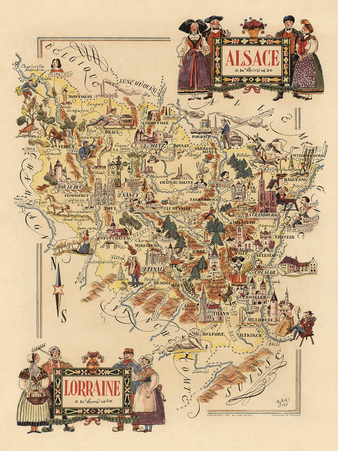El mapa de "Alsacia y Lorena", elaborado por el estimado cartógrafo Jacques Liozu en 1951, es un impresionante ejemplo del arte cartográfico de mediados del siglo XX. Liozu, conocido por sus mapas detallados y culturalmente ricos, ha capturado magistralmente la esencia de estas regiones históricamente significativas. Este mapa no es meramente una representación geográfica, sino un vibrante tapiz que entrelaza los elementos culturales, históricos y naturales de Alsacia y Lorena. Cada ilustración está meticulosamente dibujada, dando vida al rico patrimonio y a los diversos paisajes de estas regiones francesas.