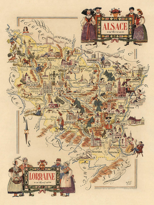 El diseño del mapa es un festín para los ojos, con colores vivos e intrincadas ilustraciones que representan el relieve y el terreno de manera pictórica. El estilo artístico es tanto decorativo como informativo, con encantadoras representaciones de personas locales en vestimenta tradicional, monumentos icónicos y eventos históricos significativos. Este mapa es un viaje visual a través del tiempo, mostrando las maravillas arquitectónicas como la Catedral de Estrasburgo y el Castillo de Haut-Koenigsbourg, junto a recordatorios conmovedores de la historia como la Batalla de Verdún y la Línea Maginot.