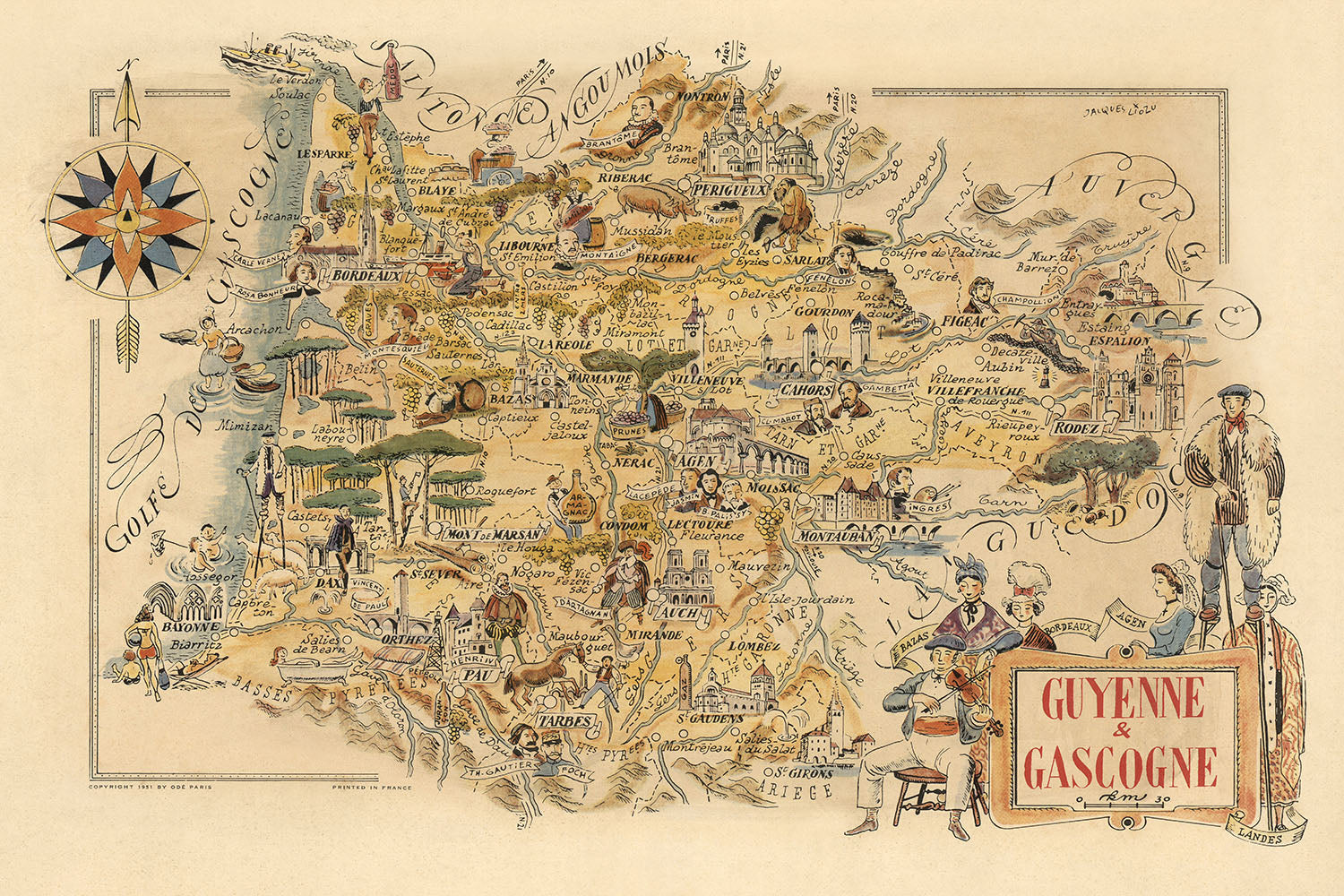 - El mapa proporciona una instantánea histórica de las regiones de Guyenne y Gascogne tal como se percibían a mediados del siglo XX.