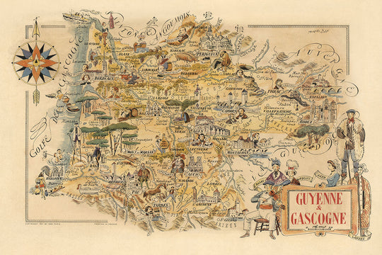 Históricamente, el mapa ofrece una instantánea de Guyenne y Gascogne tal como se percibían en la mitad del siglo XX, proporcionando valiosos conocimientos sobre el contexto cultural e histórico de la época. Las ilustraciones detalladas y los elementos temáticos capturan la esencia de las regiones, haciendo del mapa un recurso valioso para historiadores y coleccionistas por igual. El mapa "Guyenne & Gascogne" de Jacques Liozu no es solo una herramienta geográfica, sino una obra de arte que encapsula la rica herencia y diversidad cultural de estas históricas provincias francesas.