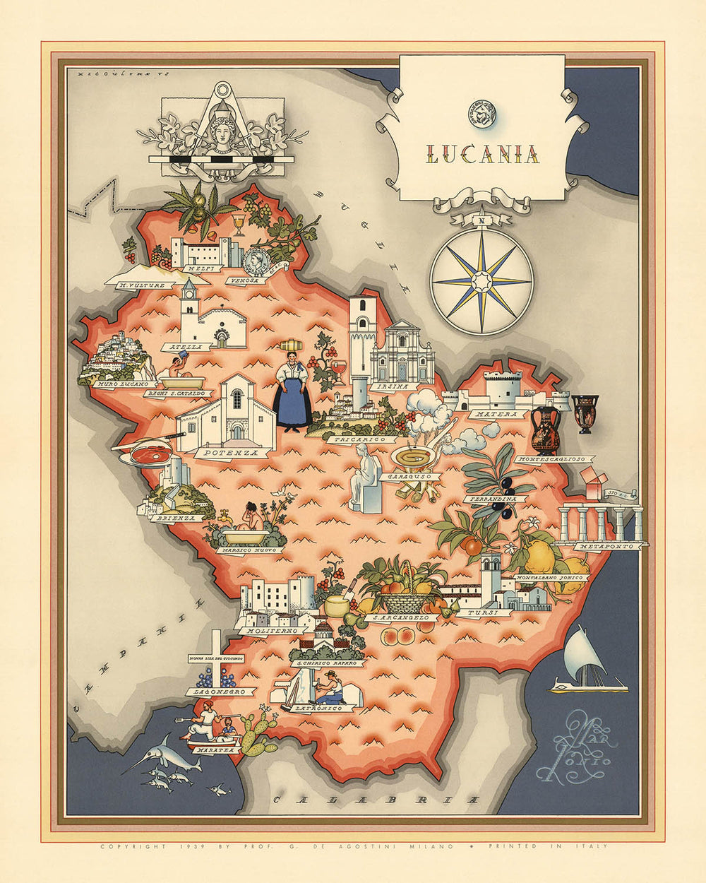 Antigua Mapa Pictórico de Lucania por De Agostini, 1938: Potenza, Matera, Pollino, Sassi di Matera, Castel del Monte