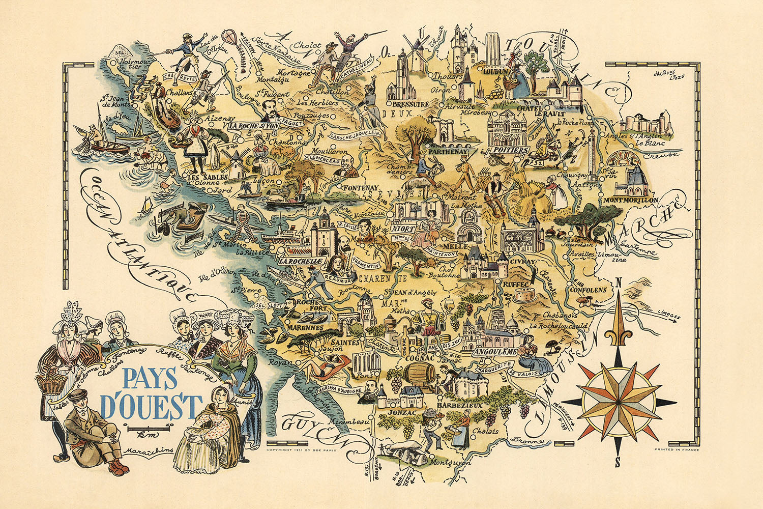 Antigua Mapa Pictórico de Poitou-Charentes por Liozu, 1951: La Rochelle, Poitiers, Angulema, Marais Poitevin