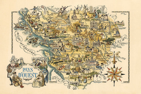 Jacques Liozu, renombrado por sus mapas detallados y artísticamente ricos, ha impregnado el "Pays d'Ouest" con una riqueza de elementos históricos y culturales. El mapa es un tesoro de hitos históricos, desde el imponente Château de Saumur hasta el legendario Château de Chinon. Cada hito está intrincadamente ilustrado, proporcionando un vistazo a la grandeza arquitectónica y la importancia histórica de estos sitios. El trabajo de Liozu trasciende la mera cartografía, ofreciendo una narrativa que conecta al espectador con la rica historia y el patrimonio cultural de la región.