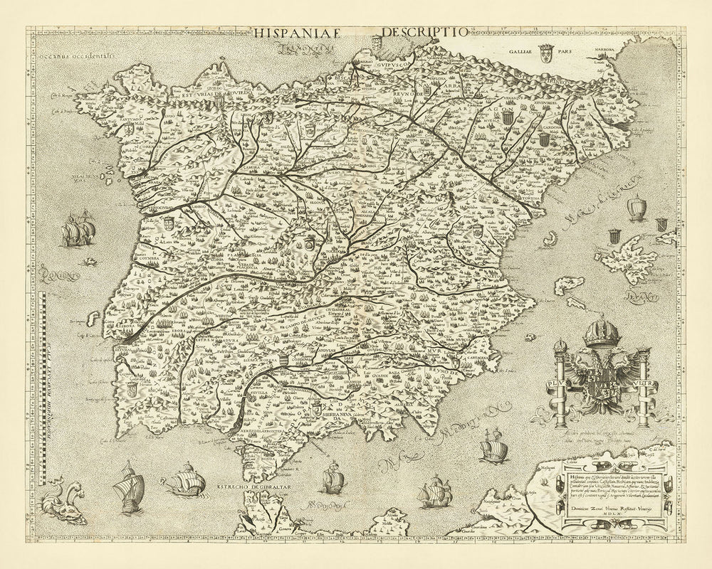 Los accidentes geográficos representados en el mapa, incluidos el Estrecho de Gibraltar, los ríos Ebro, Duero, Tajo, Guadiana y Guadalquivir, así como los Pirineos, el Cantábrico, el Sistema Central y Sierra Morena, ofrecen una visión completa de la Península Ibérica. Los diversos paisajes de la península. La representación detallada de ciudades y pueblos, desde Lisboa y Sevilla hasta Valencia y Barcelona, ofrece una visión de los centros urbanos que desempeñaron papeles fundamentales en la vida política, económica y cultural de España y Portugal durante el Renacimiento.