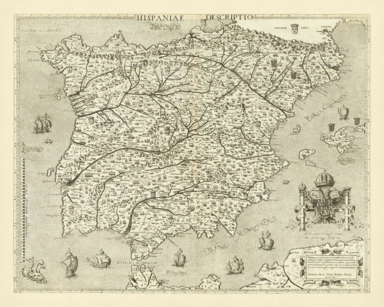 La meticulosa artesanía de Domenico Zenoi es evidente en cada aspecto de la "Hispaniae descriptio". El mapa está adornado con elementos decorativos característicos de la época, incluidos pequeños escudos de armas territoriales, ocho veleros y tres monstruos marinos míticos, lo que añade una capa de intriga visual. Las representaciones pictóricas de ciudades y zonas montañosas dan vida al paisaje de la Península Ibérica, mientras que la inclusión de las Columnas de Hércules y el escudo de armas de la monarquía española impregna el mapa de un sentido de orgullo nacional y significado histórico. Estas características no sólo mejoran el atractivo estético del mapa, sino que también brindan información valiosa sobre el paisaje geopolítico de la Europa del siglo XVI.