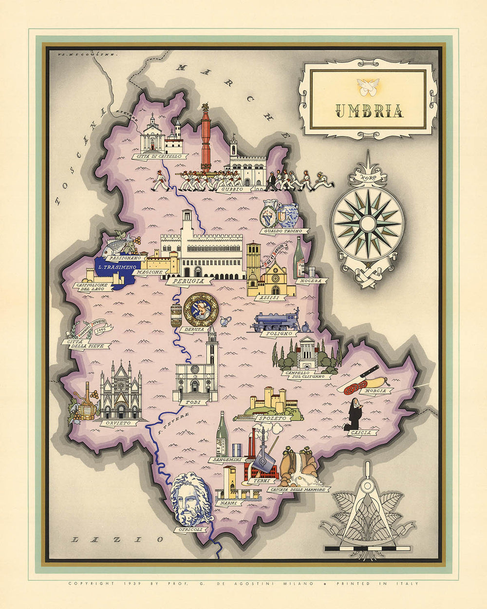 Este mapa de la región italiana de Umbría, publicado originalmente en 1938 por la empresa cartográfica italiana Istituto Geografico De Agostini, es un ejemplo hermoso y detallado de un mapa temático y pictórico. El mapa se centra principalmente en la región italiana de Umbría y presenta viñetas coloridas de estructuras, naturaleza, actividades, productos y cultivos nativos de la región. Los pueblos y ciudades están claramente etiquetados y el mapa está adornado con detalles plateados y dorados.