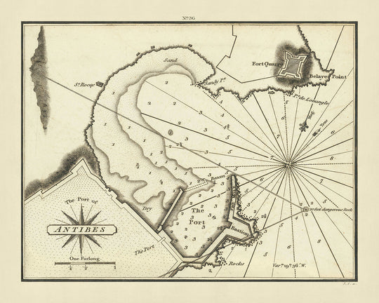 Como un mapa náutico, el mapa enfatiza los detalles prácticos vitales para los marineros de la época. Anota meticulosamente las sondas en brazas, ilustrando las profundidades de las aguas, lo cual era crucial para una navegación segura. La inclusión de una rosa de los vientos y las indicaciones de las corrientes de agua mejoran aún más su utilidad. Importante, el mapa también destaca las instalaciones estratégicas alrededor de Antibes, incluyendo el icónico Fort Carré, una fortificación en forma de estrella del siglo XVI que jugó un papel significativo en la defensa regional. Estas características no solo sirvieron propósitos de navegación, sino que también proporcionaron a los marineros británicos información esencial sobre las capacidades navales y fortificaciones francesas durante los conflictos en curso de la época.