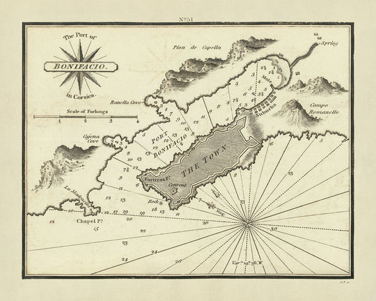 El Puerto de Bonifacio ocupa una posición de considerable importancia histórica, actuando como puerta de entrada entre las regiones occidental y oriental del Mediterráneo. Este mapa captura la esencia de Bonifacio durante una época en la que la navegación y el comercio marítimo eran el sustento de las economías europeas. La representación detallada de lugares emblemáticos como Ranella Cove, la Fortaleza y varios edificios eclesiásticos como iglesias y conventos no solo ayuda a la navegación sino que también sirve como una instantánea histórica del paisaje arquitectónico y cultural de la zona a principios del siglo XIX.