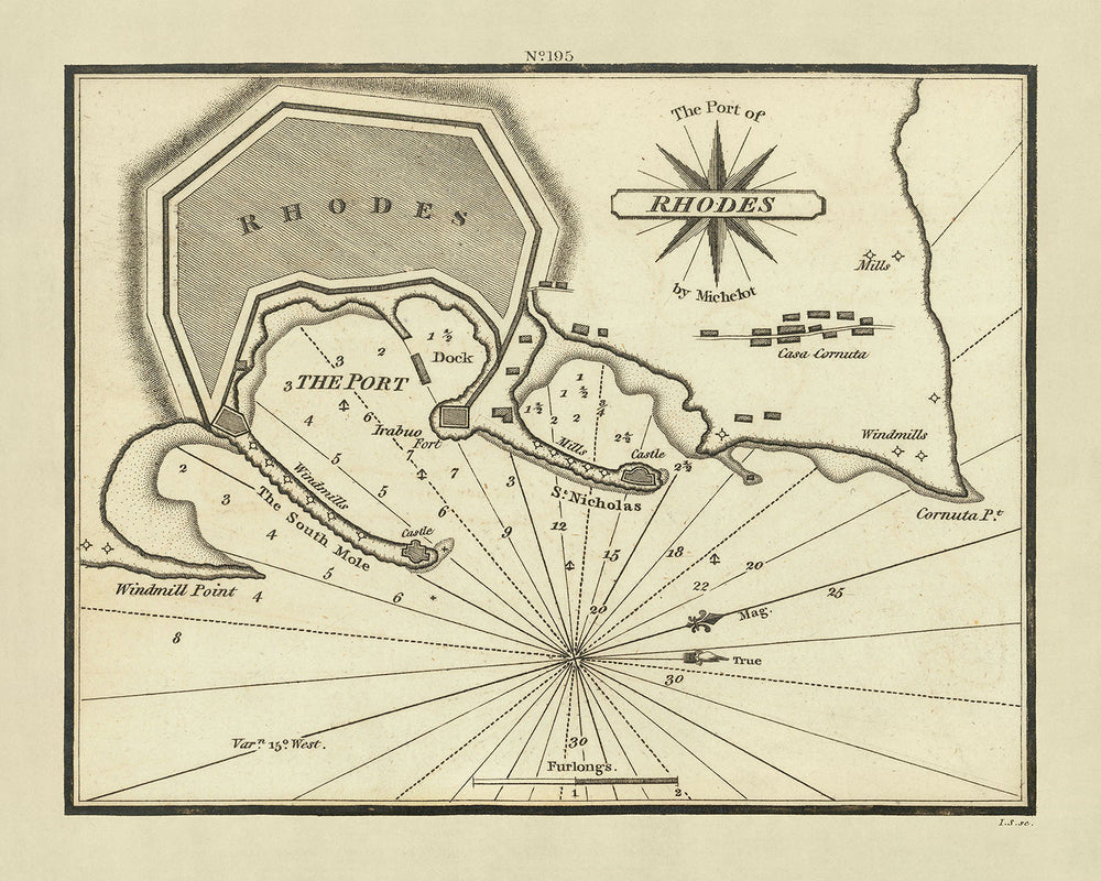 Históricamente, Rodas ha sido un centro marítimo fundamental debido a su posición estratégica en el Mar Egeo. Este gráfico no sólo capta la disposición física del puerto y sus alrededores inmediatos, sino que también refleja la importancia histórica de Rodas como cruce de caminos de varias civilizaciones. Las representaciones detalladas de fortificaciones y edificios insinúan el papel de la isla en la defensa y el comercio, ofreciendo una visión de la bulliciosa vida que alguna vez invadió este puerto.
