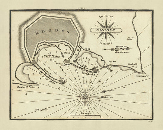 "El Puerto de Rodas" es una cautivadora carta náutica elaborada por el estimado William Heather en 1802, un período marcado por la exploración marítima y la expansión del conocimiento de la navegación. Este gráfico es un artefacto importante del trabajo pionero de Heather, El nuevo piloto del Mediterráneo, que constituye el primer intento inglés de documentar sistemáticamente los innumerables puertos del Mediterráneo. A diferencia de sus predecesores franceses e italianos, que comenzaron con la publicación de Joseph Roux en Marsella en 1764, las cartas de Heather se distinguen por su meticuloso grabado y claridad, un testimonio de las hábiles manos del grabador londinense John Stephenson.