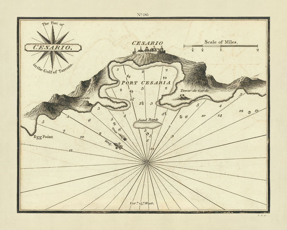Este mapa es un testimonio de los desafíos de navegación y la destreza artística de la cartografía del siglo XIX. Orientado con el noreste en la parte superior, detalla meticulosamente la costa del Golfo de Tarento, proporcionando sondeos, anclajes y corrientes esenciales para una navegación marítima segura. Características notables como la ciudad de Cesario y la estratégica Torre de Garde están elegantemente marcadas, ofreciendo un vistazo a la importancia geográfica e histórica de estos lugares. La inclusión de una rosa de los vientos y el cálculo preciso de la variación de la brújula a 15 grados al oeste ejemplifican aún más la utilidad y precisión del mapa.