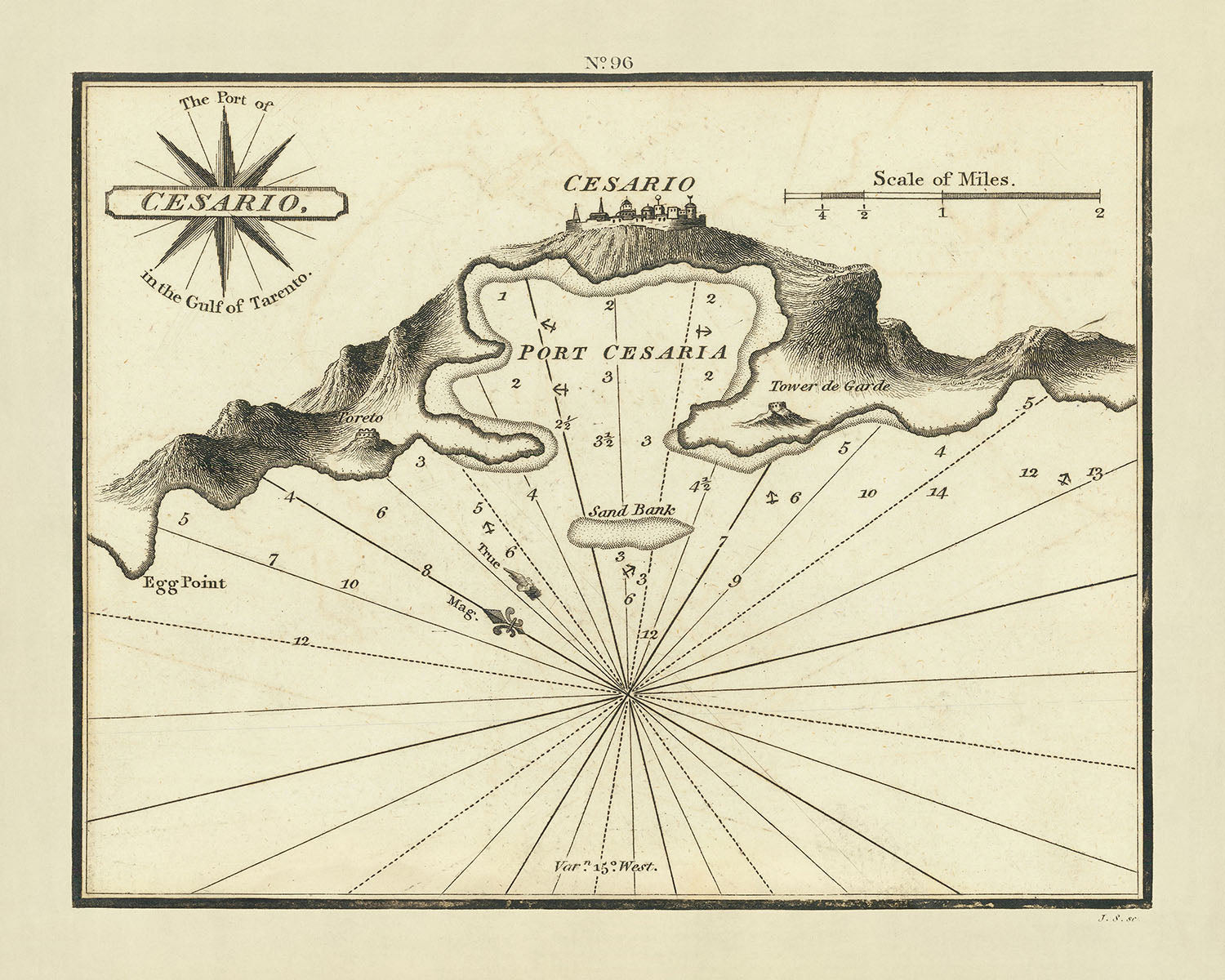Antigua carta náutica de Porto Cesareo por Heather, 1802: Sur de Italia, Golfo de Tarento, Rosa de los Vientos