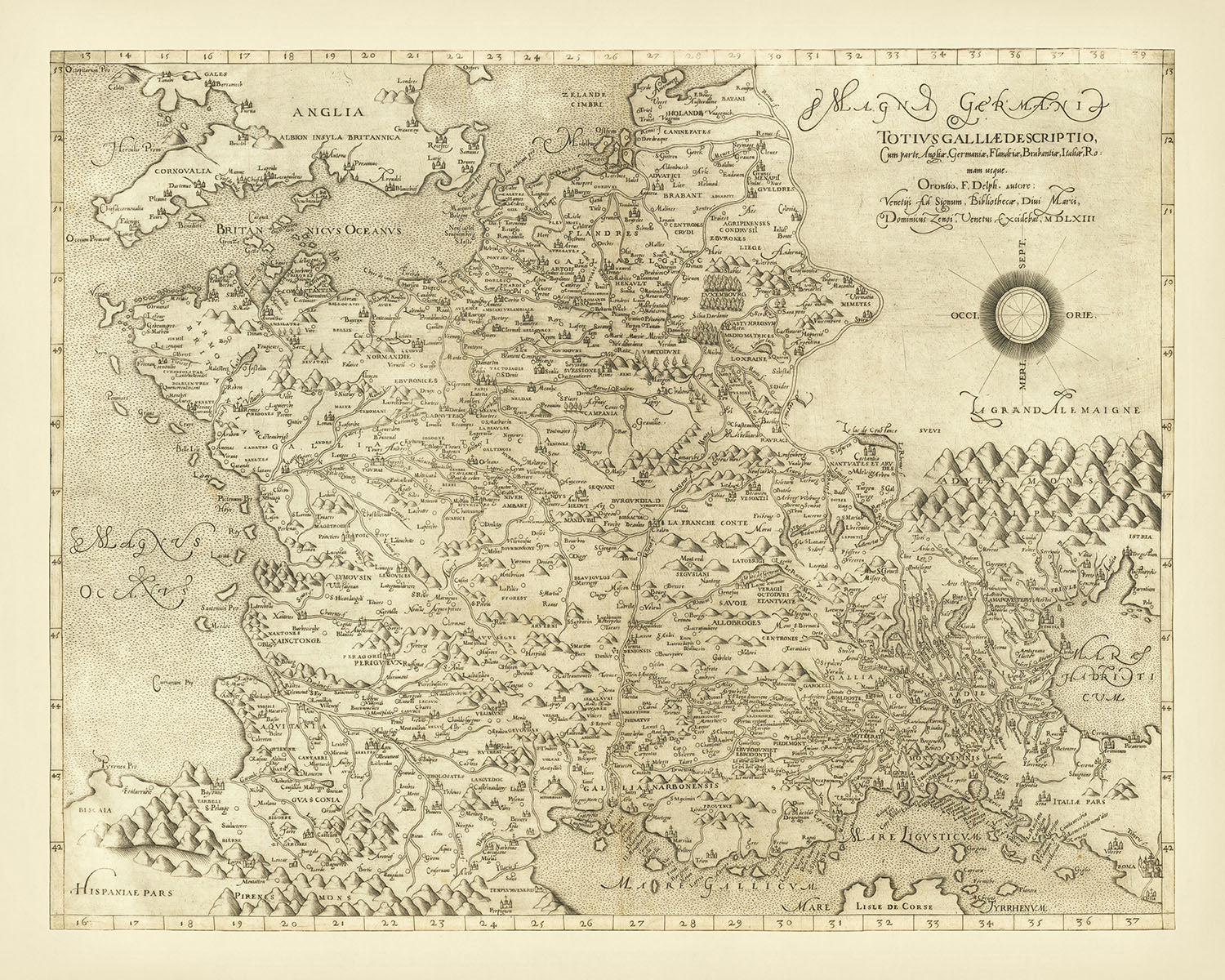 El alcance geográfico del mapa es vasto, abarcando la totalidad de Francia, las regiones del norte de Italia y los culturalmente ricos Países Bajos. Ciudades notables como Lyon, Marsella, Milán y Venecia están destacadas, proporcionando un vistazo a los centros urbanos que desempeñaron roles fundamentales en la historia y el desarrollo de Europa. El mapa también se extiende a partes de Inglaterra, incluyendo Gales, y llega tan al sur como Roma, ilustrando la interconexión de estas regiones durante el período del Renacimiento. La cuidadosa representación de los límites políticos y características naturales subraya la importancia de estas áreas en el contexto europeo más amplio.