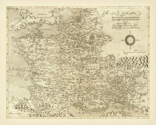 Presentamos la exquisita "Totius galliae descriptio, cum parte Angliae, Germaniae, Flandriae, Brabantiae, Italiae, Romam usque," una obra maestra de la cartografía elaborada por el renombrado Domenico Zenoi en 1561. Este raro mapa de la Escuela Lafreri, publicado en Venecia, captura la esencia del conocimiento geográfico y la expresión artística del siglo XVI. Basado en las influyentes obras de Oronce Fine y Giovanni Andrea Vavassore, este mapa condensa meticulosamente la vasta extensión de Francia, el norte de Italia y los Países Bajos en un formato detallado y visualmente cautivador. La inclusión de muchos topónimos en francés añade una capa de autenticidad y riqueza histórica a esta notable pieza.