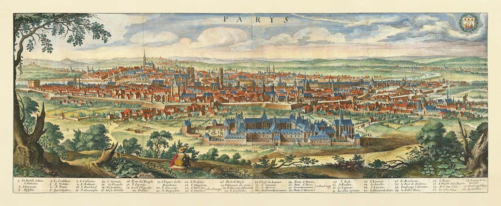 Notre Dame está aquí, por supuesto, al igual que Saint-Chapelle en la Île de la Cité con un encantador Sena azul corriendo. ¡Dominando el lado izquierdo del mapa es la Bastilla, y como puede ver, ¡que solía ser el borde de la ciudad! El edificio prolongado a la derecha del medio, con el techo azul, es el Louvre.