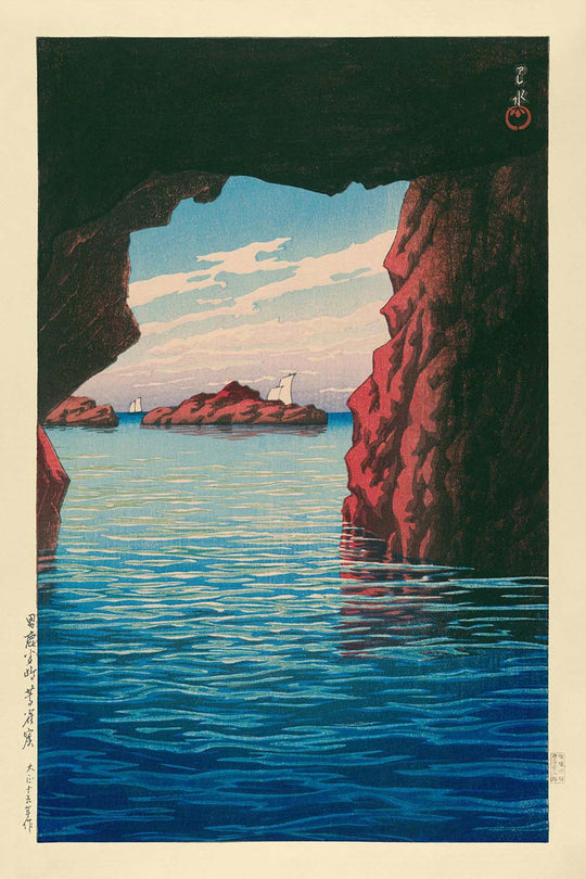 La Caverna Kojaku en la Península de Oga, de Hasui Kawase, creada en 1935, es una exquisita impresión en madera que captura vívidamente el atractivo místico de la costa japonesa. Reconocido por su significativa contribución al movimiento Shin-Hanga, Hasui fusiona bellamente las influencias tradicionales japonesas y occidentales, dando nueva vida a la atemporal forma de arte ukiyo-e.