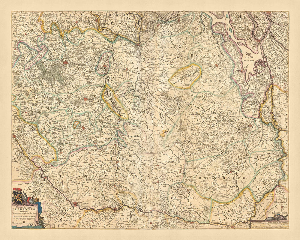 Sumérgete en la riqueza histórica de la 'Tabula Ducatus Brabantiae continens Marchionatum Sacri Imperii et Dominium Mechliniense', un cautivador mapa elaborado por Nicolaes Visscher II en 1690. Traducido al inglés, el título dice 'Mapa del Ducado de Brabante, que contiene el Marquesado del Sacro Imperio Romano Germánico y el Dominio de Mechlin'. El foco de este mapa es el Ducado de Brabante, un área que hoy abarca partes de Bélgica y los Países Bajos. El mapa es un testimonio de la Edad de Oro holandesa, un período en el que los holandeses fueron pioneros en cartografía y exploración.