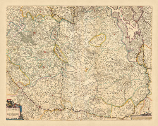La 'Tabula Ducatus Brabantiae continens Marchionatum Sacri Imperii et Dominium Mechliniense' es más que un simple mapa; es un viaje en el tiempo que te lleva a finales del siglo XVII. Los contornos coloreados a mano y los detalles grabados muestran la meticulosa artesanía del mapa. El relieve que se muestra pictóricamente realza aún más el atractivo visual del mapa. Si es un entusiasta de la historia, un amante de la cartografía o simplemente alguien que aprecia las bellas artes, este mapa es un tesoro escondido de conocimientos históricos y geográficos.