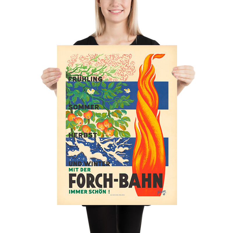 Design and color: Dominated by cool blues and fresh greens, with vibrant accents of orange, the palette captures the rhythm of the seasons—blue for alpine air and distant lake light, green for flourishing hillsides, and orange for autumnal warmth and the poster’s central flame-like motif. Scherer’s clean, sans-serif lettering anchors the image, while floral and fruit details lend organic texture. The seasonal panels are juxtaposed with striking economy, creating a brisk visual pace that mirrors the ease of rail travel. It’s an eloquent blend of Swiss graphic clarity and expressive color—equally at home in modern, eclectic, or vintage-inspired interiors.