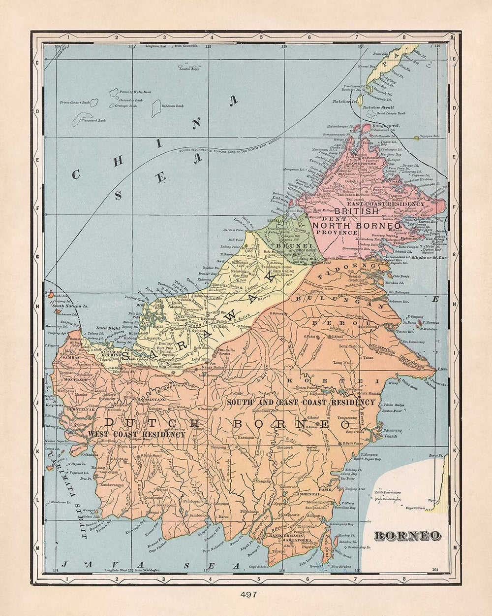 - Detailed depiction of Borneo’s colonial-era political boundaries, including Dutch and British possessions