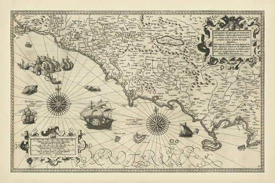 Beyond its aesthetic allure, this map is a document of profound historical significance. It draws upon the accumulated wisdom of Italian, Spanish, and Portuguese portolan charts, synthesizing centuries of seafaring knowledge into a single, cohesive vision. As the first printed navigational chart of this stretch of coastline, it represents a turning point in the evolution of maritime exploration and trade. Rarely seen on the market and steeped in the legacy of its legendary creator, this map is not only a collector’s treasure but also a tangible link to the age when the boundaries of the world were being redrawn by those bold enough to chart them.
