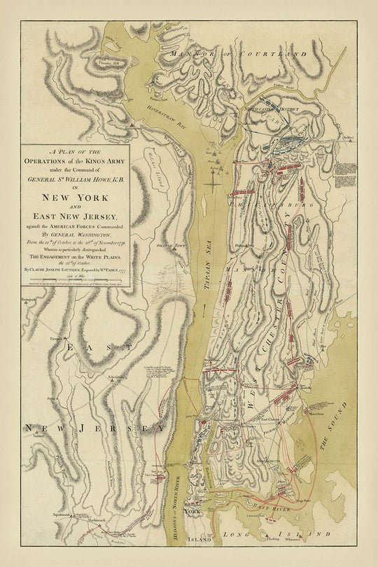 - Nombre del mapa: Un Plan de las Operaciones del Ejército del Rey bajo el mando del General Sr. William Howe, K.B. en Nueva York y Nueva Jersey Oriental, contra las Fuerzas Americanas comandadas por el General Washington, desde el 12 de octubre hasta el 28 de noviembre de 1776