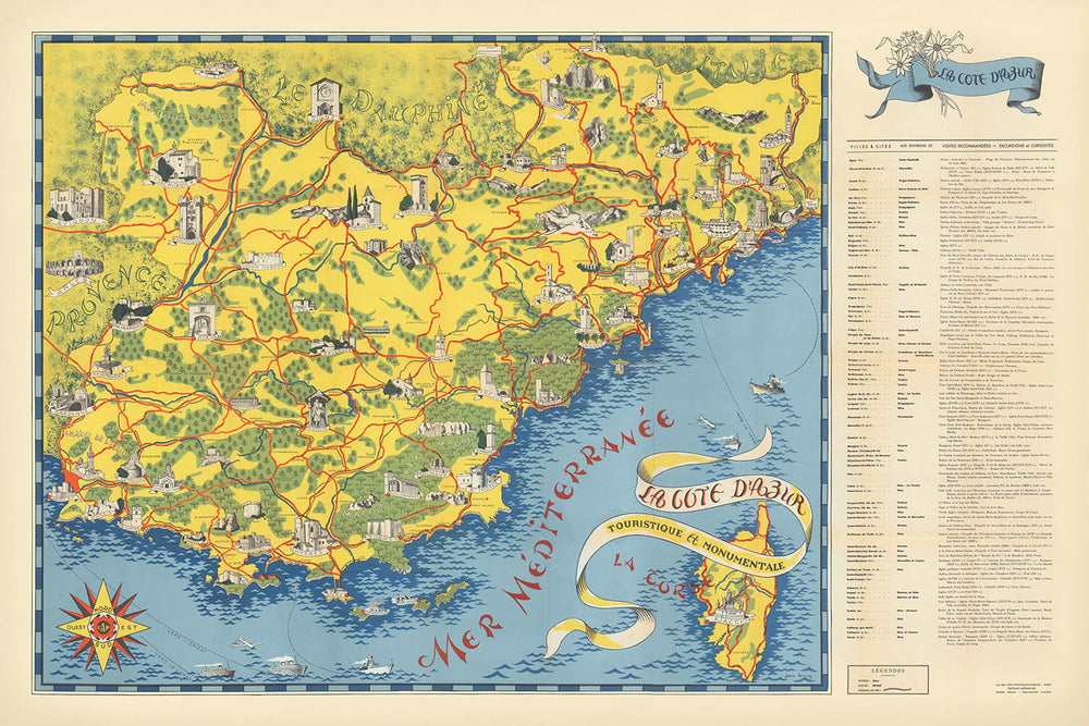 La Côte D'Azur Touristique et Monumentale, crafted in 1950 by the accomplished cartographer Flornoy Jean, stands as a captivating testament to the allure of the French Riviera at the dawn of the modern travel era. The original title, elegantly inscribed across the map, evokes both a sense of discovery and reverence for the region’s storied past. This map was conceived at a time when the Côte d'Azur was emerging as a glamorous destination for travelers seeking sun, culture, and sophistication along the Mediterranean’s fabled shores. Flornoy Jean’s creation masterfully blends practical navigation with the romance of exploration, inviting viewers to trace the Riviera’s sinuous coastline and immerse themselves in its legendary ambiance.