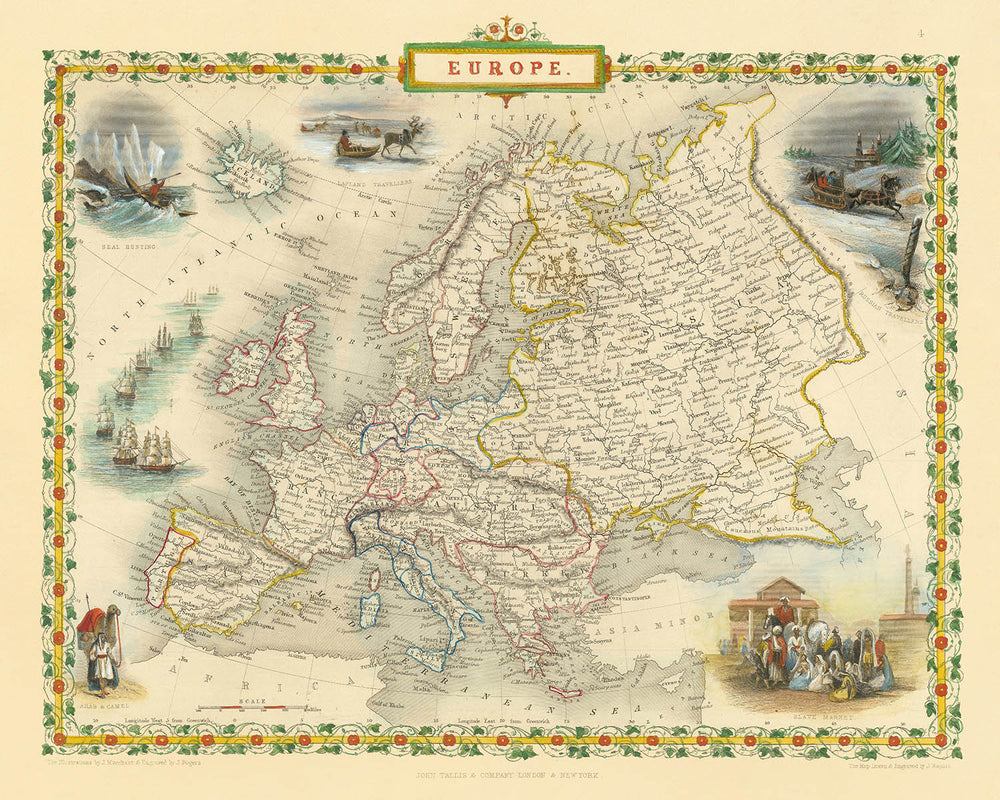 Old Map of Europe by John Tallis, 1851: Seal Hunting, Camels, Slave Market, etc.
