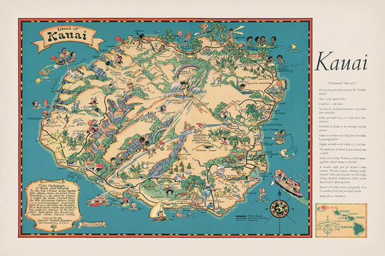Kauai’s natural wonders are given pride of place, from the serene expanse of Hanalei Bay to the wild, remote beauty of Kalalau Valley. The map also highlights the Wailua River, a lifeline through the island’s heart, and the highland sanctuary of Kokee State Park. Recreational activities—surfing, fishing, boating—are charmingly illustrated, capturing the vibrant outdoor life that has long drawn visitors to Kauai’s shores. The inclusion of local flora and traditional Hawaiian motifs further enriches the visual narrative, offering a glimpse into the island’s ecological and cultural tapestry.