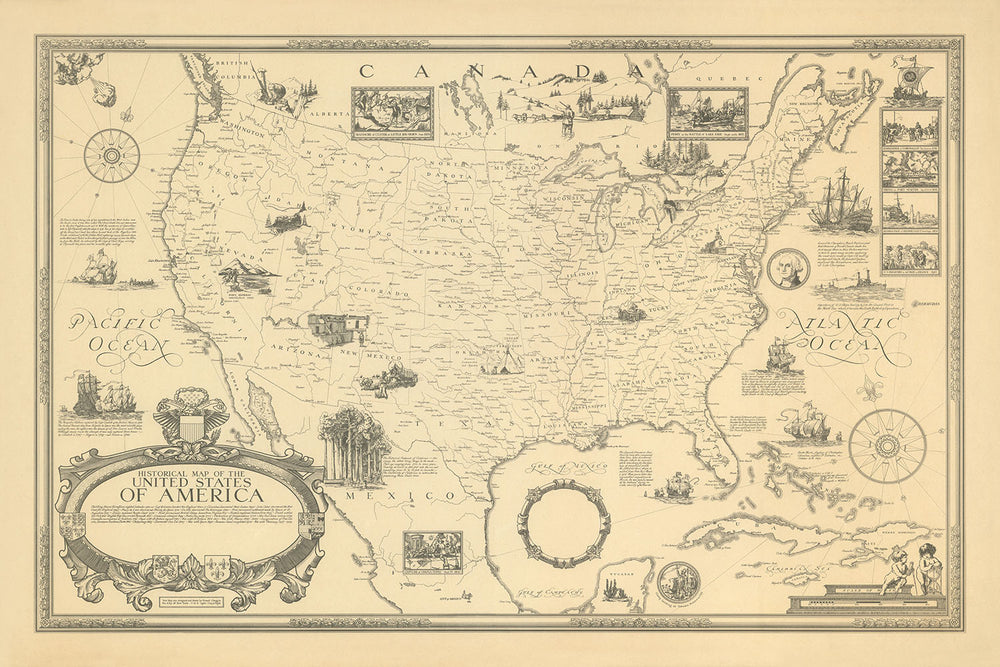 El "Mapa histórico de los Estados Unidos de América", realizado por el ilustre Ernest Clegg en 1926, es un testimonio notable del rico tapiz de la historia y la geografía estadounidenses. Este mapa, producto de la profunda experiencia de Clegg como ilustrador y cartógrafo, encapsula hermosamente el pasado de la nación a través de ilustraciones detalladas y elementos temáticos. Clegg, un artista nacido en Gran Bretaña que pasó períodos importantes en los Estados Unidos, impregnó este mapa con una mezcla única de tradiciones cartográficas estadounidenses y británicas, lo que lo convierte en una pieza cautivadora tanto para los entusiastas de la historia como para los coleccionistas.