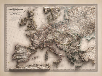 A primera vista, el mapa llama la atención sobre el amplio alcance del Imperio francés, que abarca no sólo Francia, sino también partes de Italia, España e incluso las Islas Británicas. Sin embargo, una inspección más cercana revela un panorama más completo de Europa, que abarca otras regiones importantes como Irlanda, Portugal, Alemania, Bélgica, Suiza, Austria, Polonia, Rusia, Ucrania y los Países Bajos. Cada país está marcado con meticulosa precisión, lo que demuestra el compromiso de Dyonnet con la precisión y el detalle.