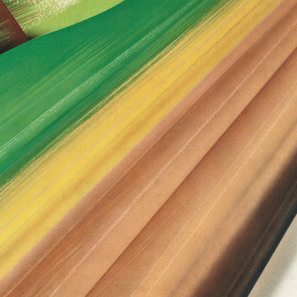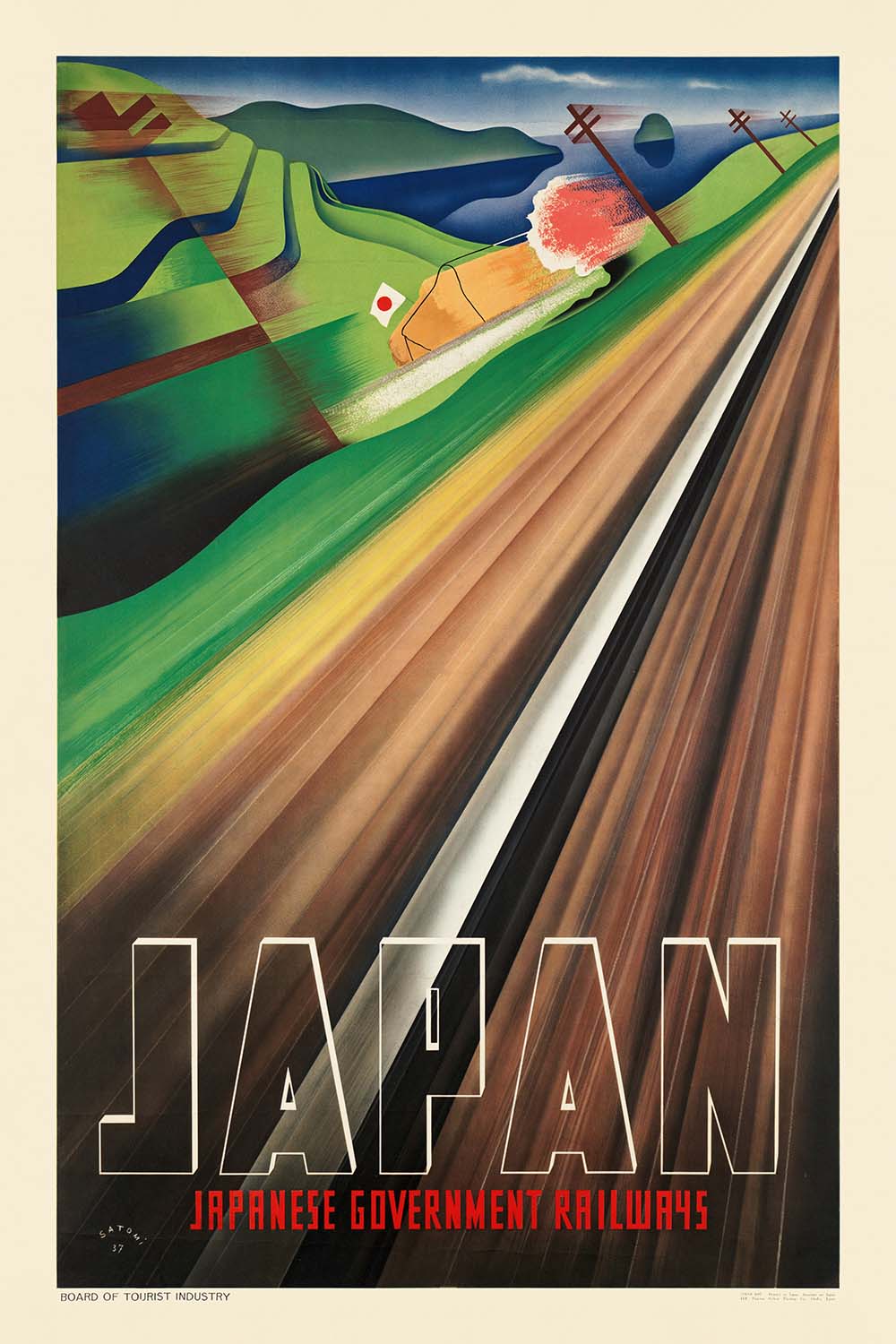 About the artist: Although detailed records of Mune Satomi’s career are scarce, the work reflects the thriving ecosystem of Japanese poster studios in the 1930s—where illustrators and typographers created bold, forward-looking imagery for railways and tourism boards. Satomi’s visual language is unmistakably Deco: simplified silhouettes, dynamic diagonals, and impeccable balance between figure and ground, all serving a message of speed, style, and national confidence.