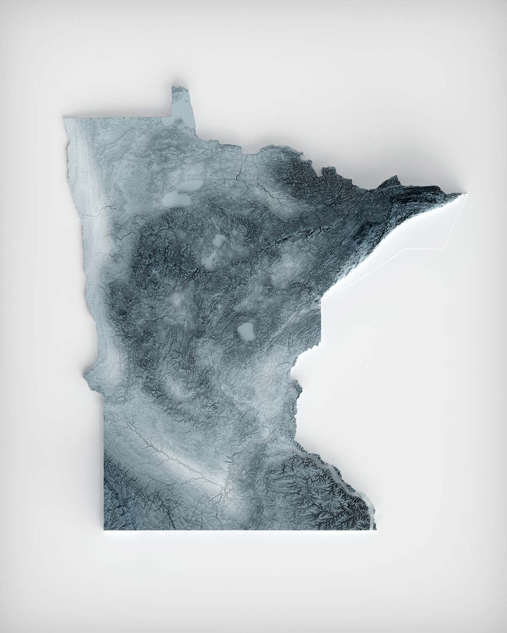 El juego de luz y sombra revela elegantemente las suaves ondulaciones de las praderas en el oeste y sur, trazando los sutiles ascensos y depresiones que distinguen el Valle del Río Rojo de las llanuras circundantes. En el norte, las escarpadas tierras altas y las antiguas crestas de roca madre de las Tierras Altas de Superior están artísticamente acentuadas, su prominencia rocosa y alturas boscosas se destacan en marcado relieve contra los contornos más suaves del corazón del estado.