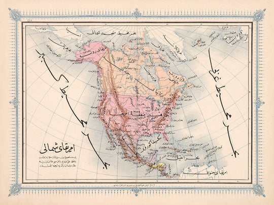 Este exquisito mapa es un testimonio de la destreza cartográfica de sus creadores, resaltando las fronteras políticas y administrativas de América del Norte con notable precisión. El mapa delinea las fronteras entre Estados Unidos, Canadá, México y partes de Centroamérica y el Caribe, ofreciendo una visión integral del panorama geopolítico del siglo XIX. Los bordes decorativos y el uso de escrituras otomanas añaden un elemento de elegancia artística, reflejando la estética cultural de la época.